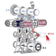 反沖洗階段原理:當(dāng)達到一定的壓差時,或設(shè)定的時間內(nèi)系統(tǒng)自動進入反沖洗狀態(tài),控制器控制閥門改變水流方向,過濾器底部隔膜關(guān)閉主通道,反沖洗進入四組噴嘴通道,和噴嘴通道連接的活塞腔內(nèi)的水壓上升,活塞向上運動克服彈簧對疊片的壓力,同時反沖洗水從四組噴嘴通道上面的 30*4 個噴嘴沿疊片切線的方向高速噴射,使疊片旋轉(zhuǎn)并均勻分開,噴洗水噴洗疊片表面,將截留在疊片上的雜質(zhì)噴洗甩出。如下圖